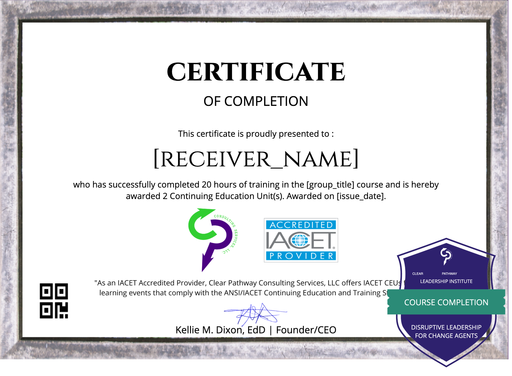 Awarded for successful completion of the Disruptive Leadership for Change Agents course focused on developing leadership skills to drive innovation, challenge the status quo, and lead meaningful change. The course included 20 instructional/contact hours and 2 accredited CEUs.