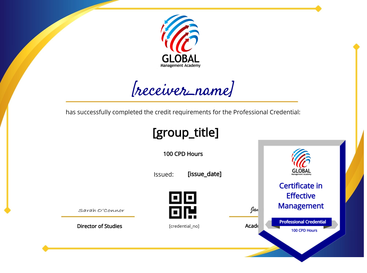 The graduate has successfully completed the Global Professional Certificate in Ethical Leadership and Governance. The program comprises 5 online courses (of 20 hours each), and a total of 100 hours of learning.