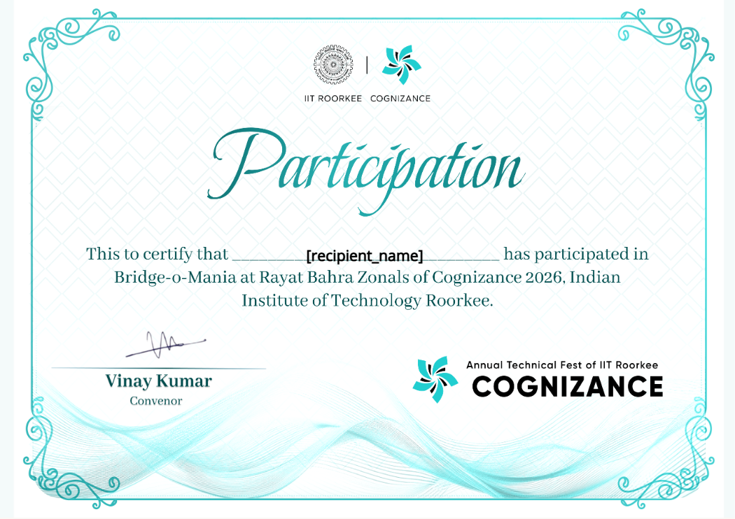 Recognizing active participation in technical workshops, technical events and case studies at Nirmaan'25 – IIT Roorkee's Civil Conclave, fostering engineering excellence and innovation.