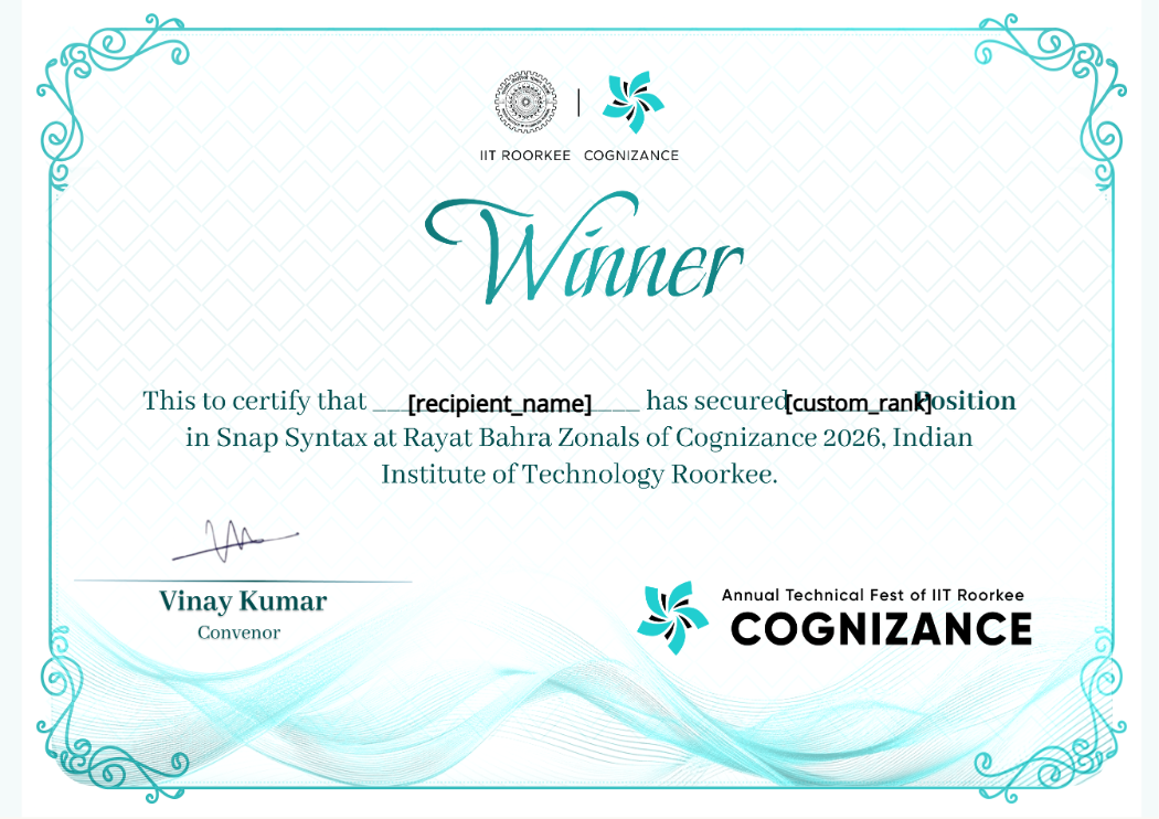 Certificate of merit for winning events at cognizance 25 , annual technical fest of IIT Roorkee