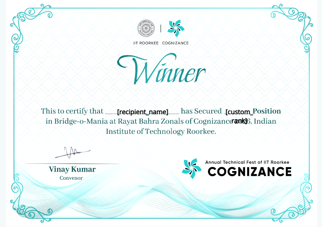 Certificate of merit for winning events at Haryana Zonals, cognizance 25 , annual technical fest of IIT Roorkee