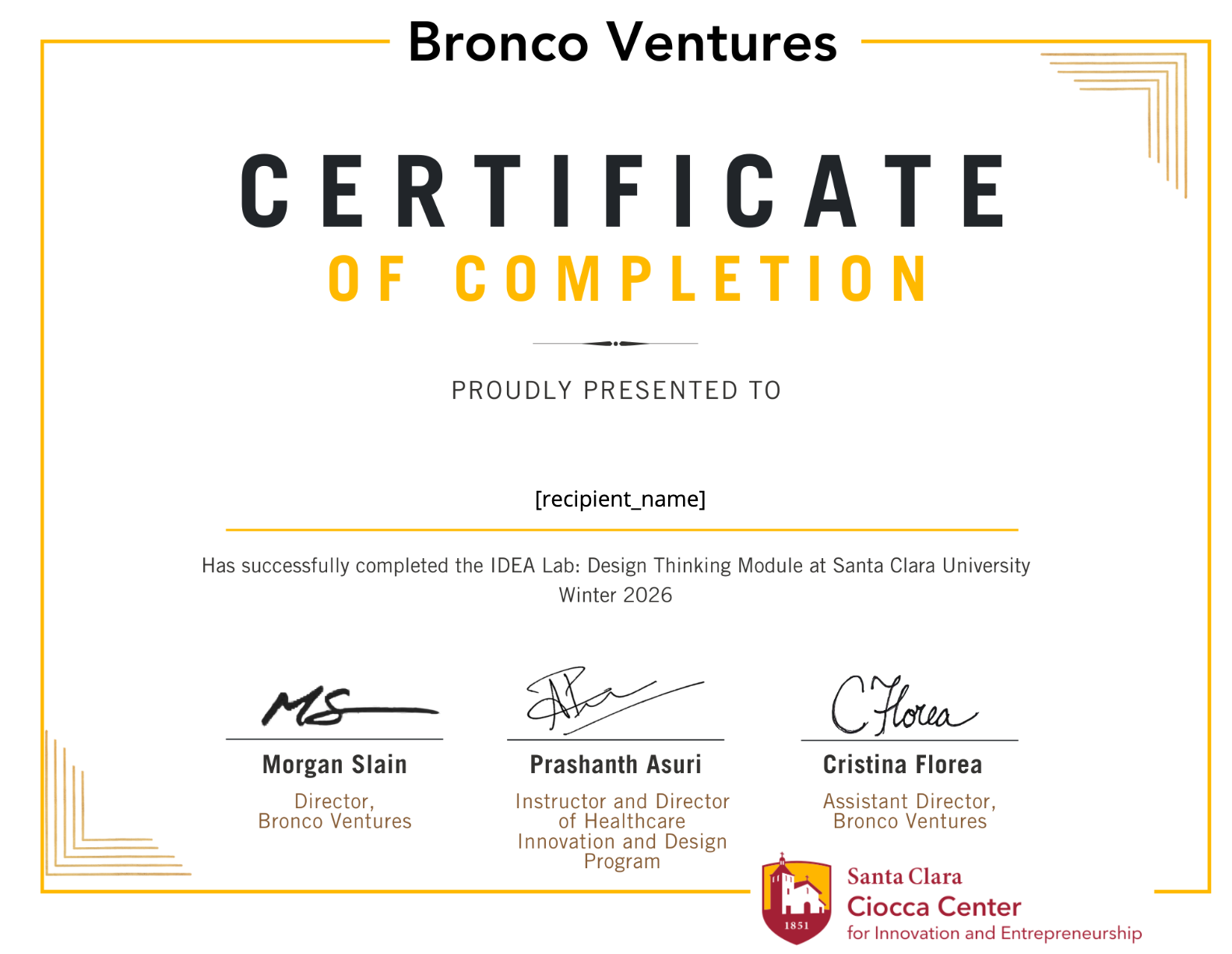 This certificate recognizes successful completion of an immersive training experience designed to cultivate the entrepreneurial mindset and provide students with a comparative perspective on Silicon Valley. Participants engaged with innovation leaders, explored emerging technologies, and developed practical skills essential to launching and growing new ideas. As part of the program, students atte…